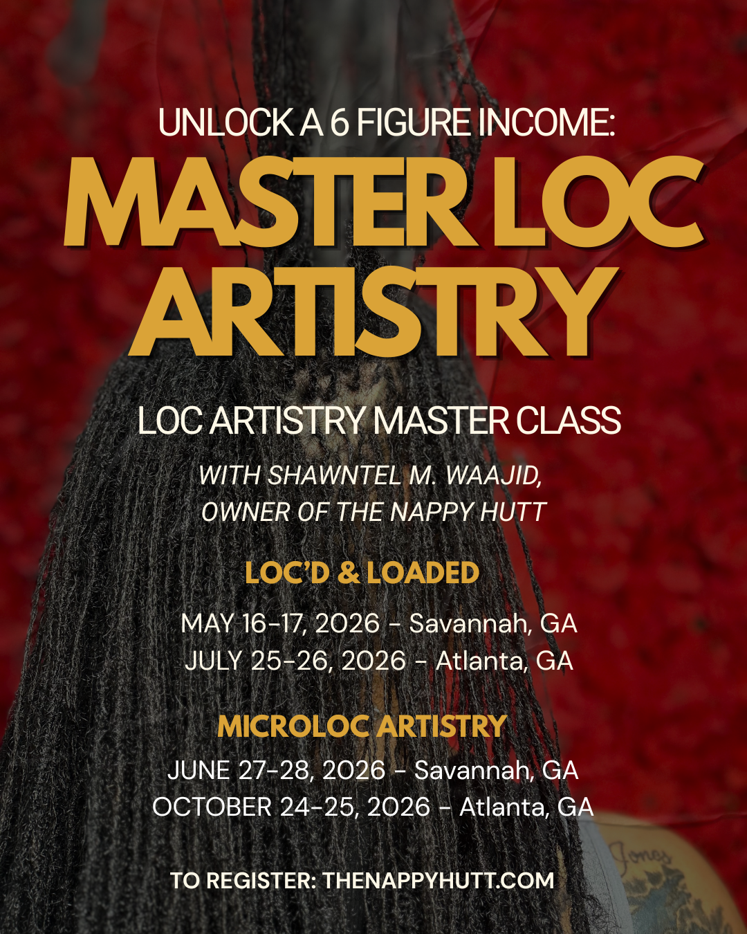 Join Shawntel Waajid, founder of Nappy Hutt LLC and educator for a two-day master class on mastering the business of loc care and artistry. We are going beyond basic maintenance to master the business and artistry of 6-figure microloc care.
